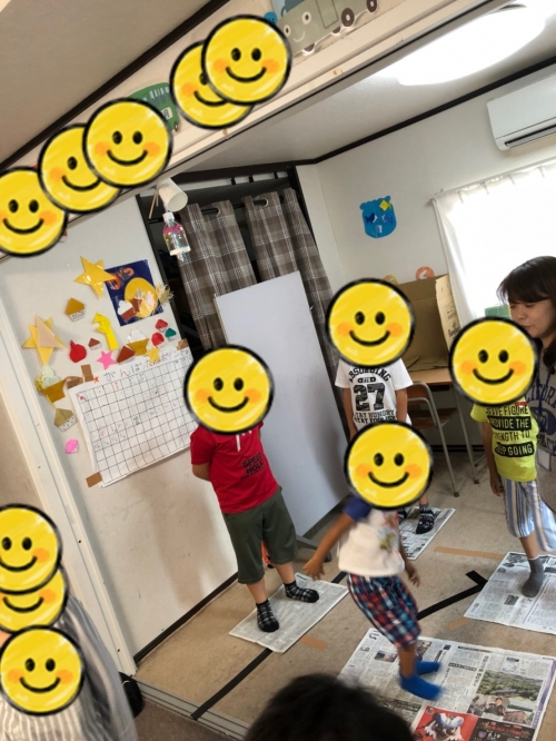 は、新聞じゃんけんをしました★新聞の上に立ち・・・じゃんけんをして新聞をたたんでいきながら、バランスを一生懸命とるみんなです★